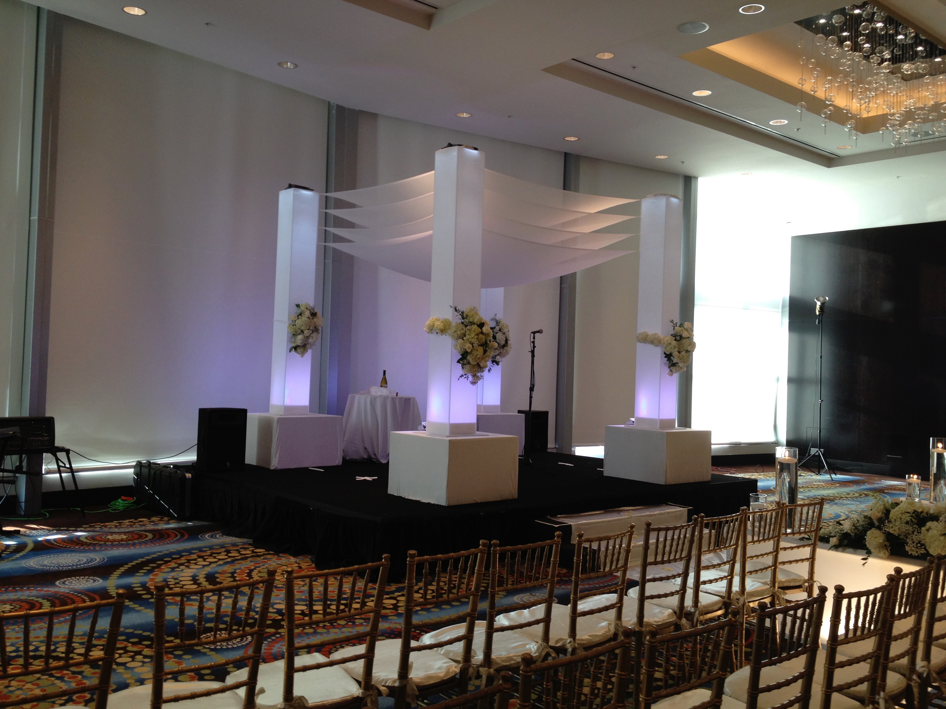 Our ultra-modern Neo Moda canopy structure is very similar to our acrylic chuppah rental. The difference is we us a frosted acrylic instead of clear. We also attached 2, 3 or 4 fabric stretched toppers. Up-lights should be added to this for the elegant feel. The pictures below show the beautiful modern chuppah we call the NEO MODA. If you are looking for something ultra-modern, then this one is for you. From South Miami Beach to Palm Beach this chuppah is one your guests will be impressed with. It makes every room look magnificent and modern.